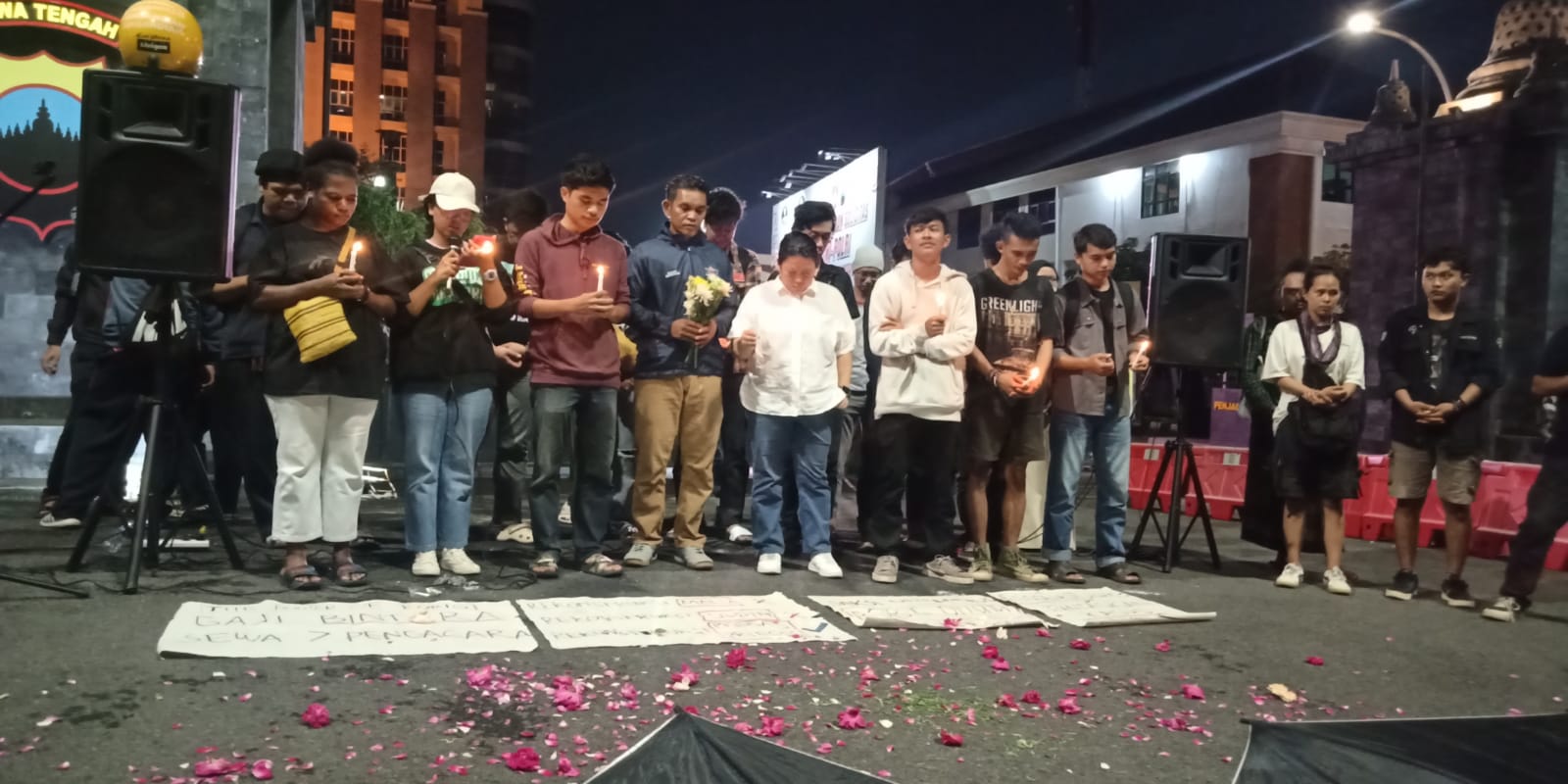 Di akhir aksi, peserta berbaris rapi dengan membawa lilin, menabur bunga dan memanjatkan doa untuk Gamma dan keluarganya secara bergantian doa lintas agama.