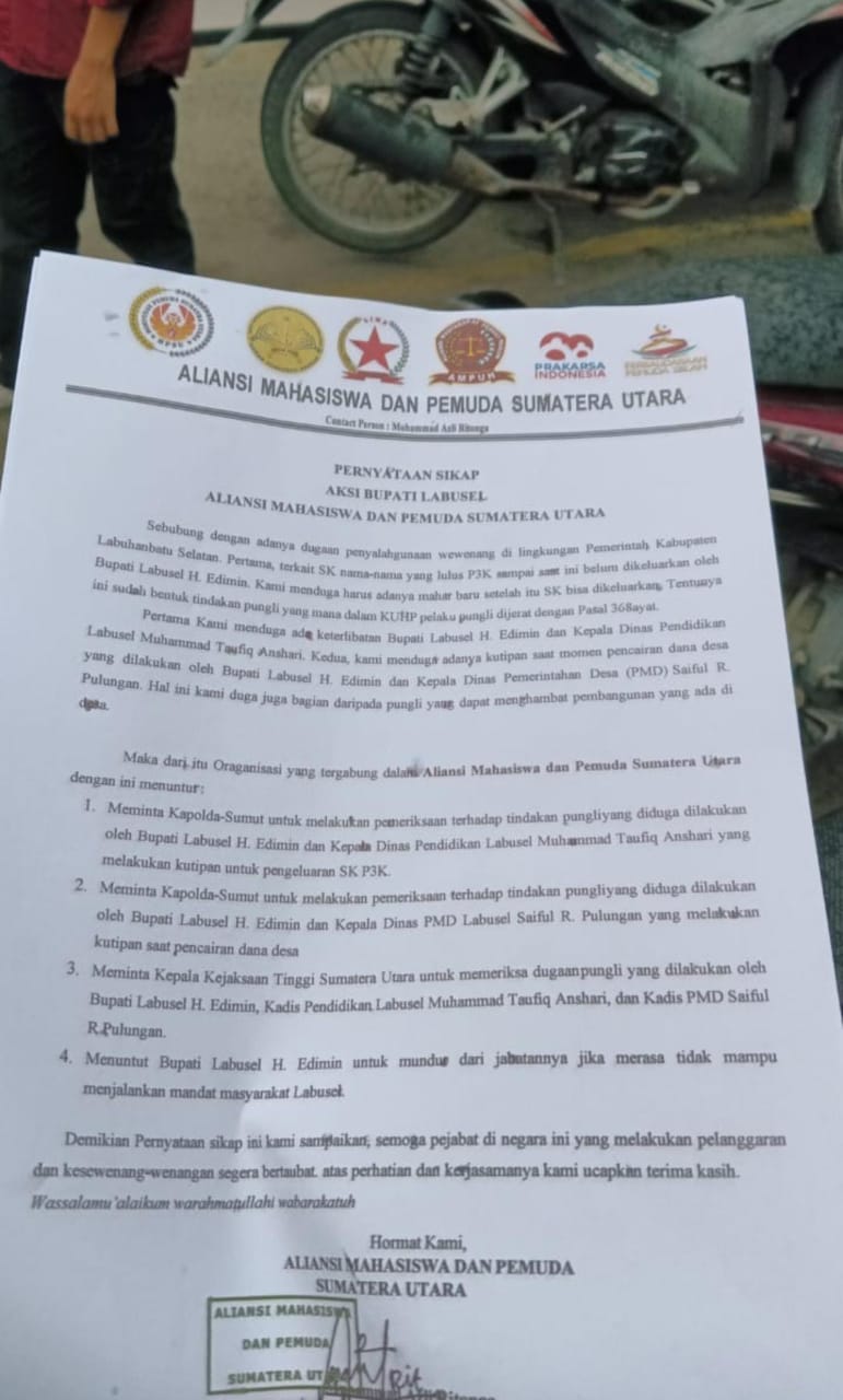 Dalam aksi tersebut, mahasiswa yang menamakan dirinya Aliansi Mahasiswa dan Pemuda Sumut itu menuntut Polda Sumut dan Kejati Sumut untuk memeriksa Bupati Labuhan Batu Selatan atas dugaan kasus pungli terhadap SK P3K.
