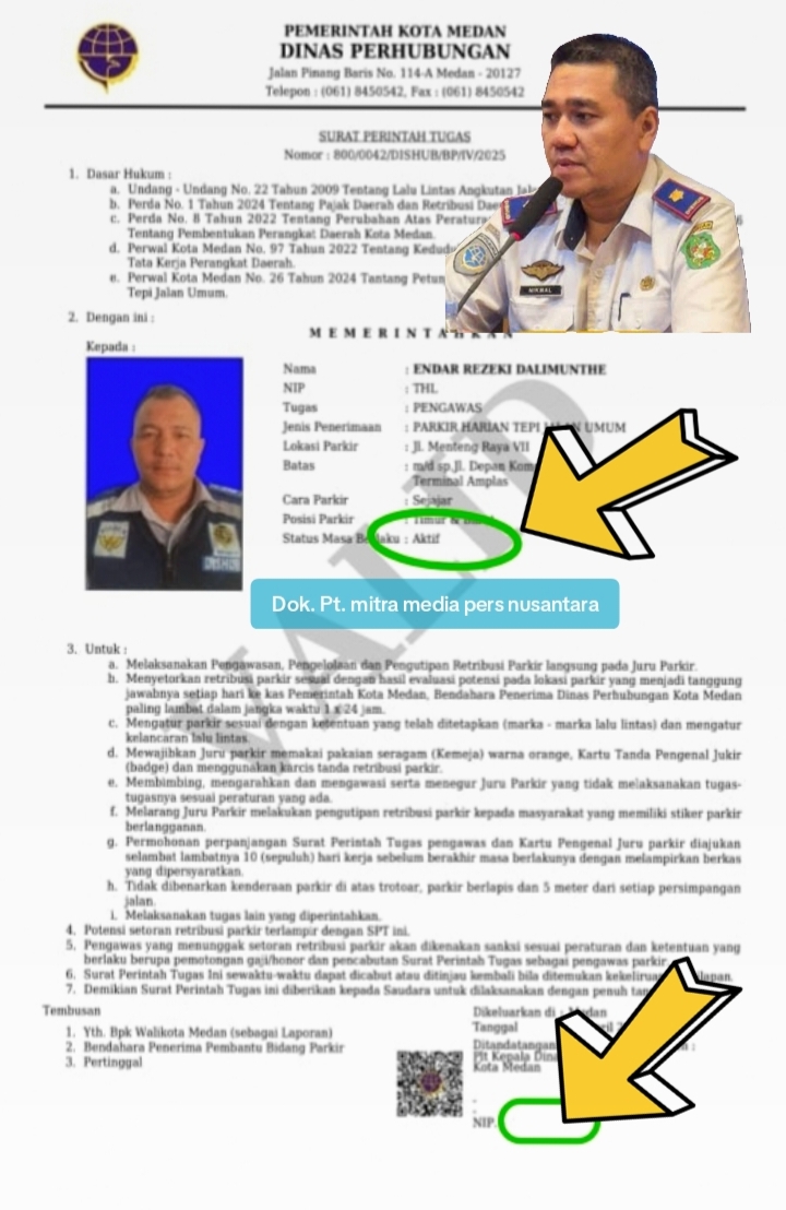 Mitratnipolri.id || Medan – kabar tidak sedap melanda Dinas Perhubungan kota Medan, dimana saatnya kota Medan bersih – bersih dari parkir liar agar PAD meningkat, kini beredar SPT (Surat Perintah Tugas) diduga palsu beredar di wilayah kota Medan. 06/ 05/2025.
