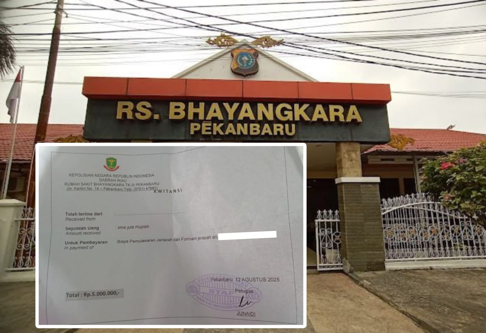 Kwitansi yang diterbitkan RS Bhayangkara pada 12 Agustus 2025 mencantumkan pembayaran Rp5 juta, namun bukan untuk otopsi, melainkan “biaya pemulasaran jenazah dan formalin jenazah”. Kwitansi tersebut ditandatangani seorang petugas bernama Junaidi.