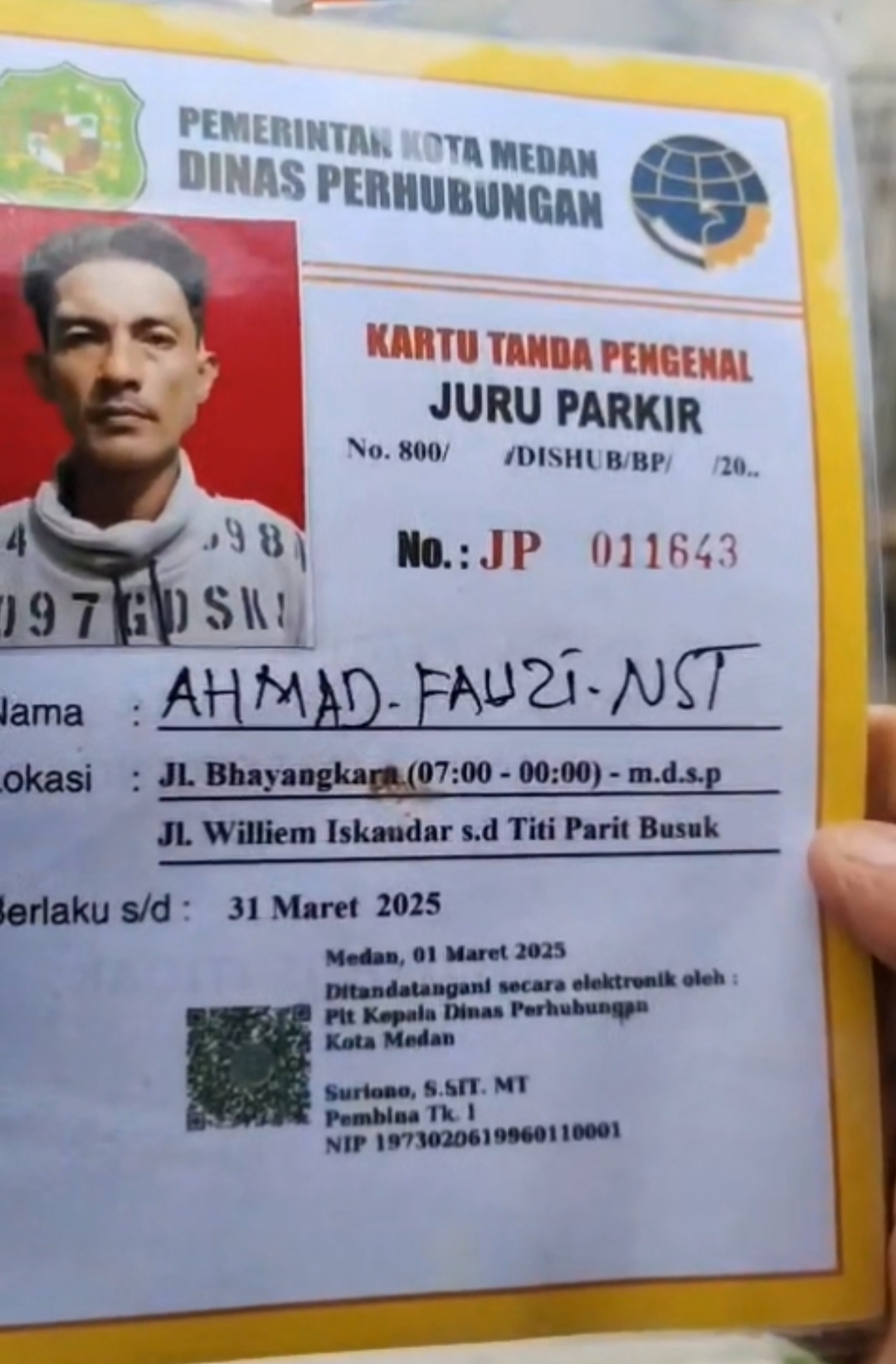 “Saya bayar nggak tentu ke Faisal Ketua kepemudaan di Jalan William Iskandar” Ucap jukir di depan BRI William Iskandar
