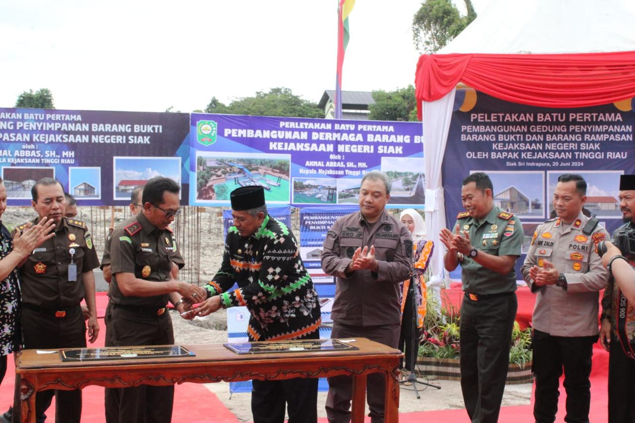 Dandim 0322/Siak hadiri Peletakan Batu pertama pembangunan gedung penyimpanan kejaksaan pada hari Kamis, 20 Juni 2024, pukul 10.35 WIB, telah dilaksanakan acara Peletakan Batu Pertama Pembangunan Gedung Penyimpanan Barang Bukti dan Barang Rampasan serta Pembangunan Dermaga Kapal Barang Bukti dan Barang Rampasan Kejaksaan Negeri Siak. Acara berlangsung di lokasi pembangunan Gedung Komplek Perkantoran Sungai Betung, Jalan Panglima Ghimbam, Kelurahan Kampung Rempak, Kecamatan Siak, Kabupaten Siak.