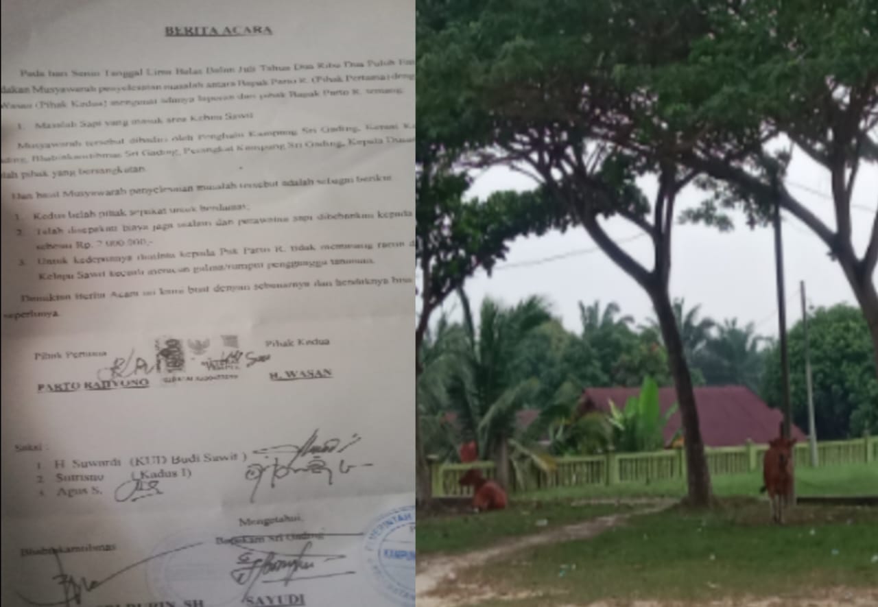 Tepat pada hari senin 15/07/2024 pukul 10 siang di kumpul kan di kantor desa srigading mulai dari pemilik sapi,korban parto beserta perangkat desa hinga bhabinkamtibmas srigading dan saksi lain nya di hadir kan,perundingan antara kedua belah pihak maka pemilik sapi mengatakan diri nya tidak tau ada nya kerusakan sawit dan pembakaran gubuk milik parto.