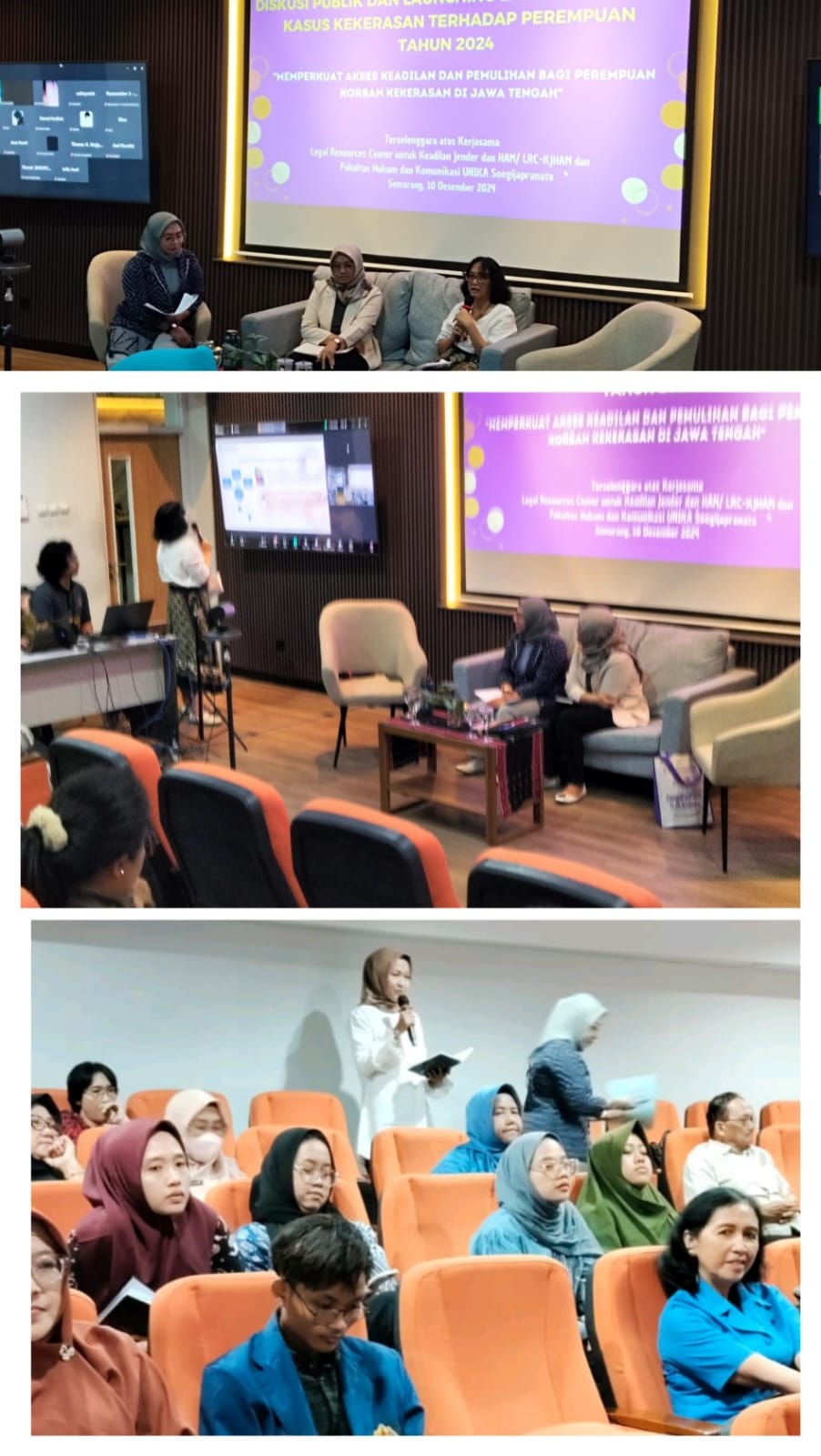 Dalam rangka kampanye 16 Hari Anti Kekerasan Terhadap Perempuan (HAKTP), LRC-KJHAM bekerja sama dengan Fakultas Hukum dan Komunikasi UNIKA Soegijapranata menyelenggarakan diskusi publik dan launching laporan tahunan situasi kekerasan terhadap perempuan di Jawa Tengah Tahun 2024 dengan tema memperkuat akses keadilan dan pemulihan bagi perempuan korban kekerasan di Jawa Tengah di Gedung Albertus Fakultas Hukum dan Komunikasi Unika Soegijapranata (10/12/2024).