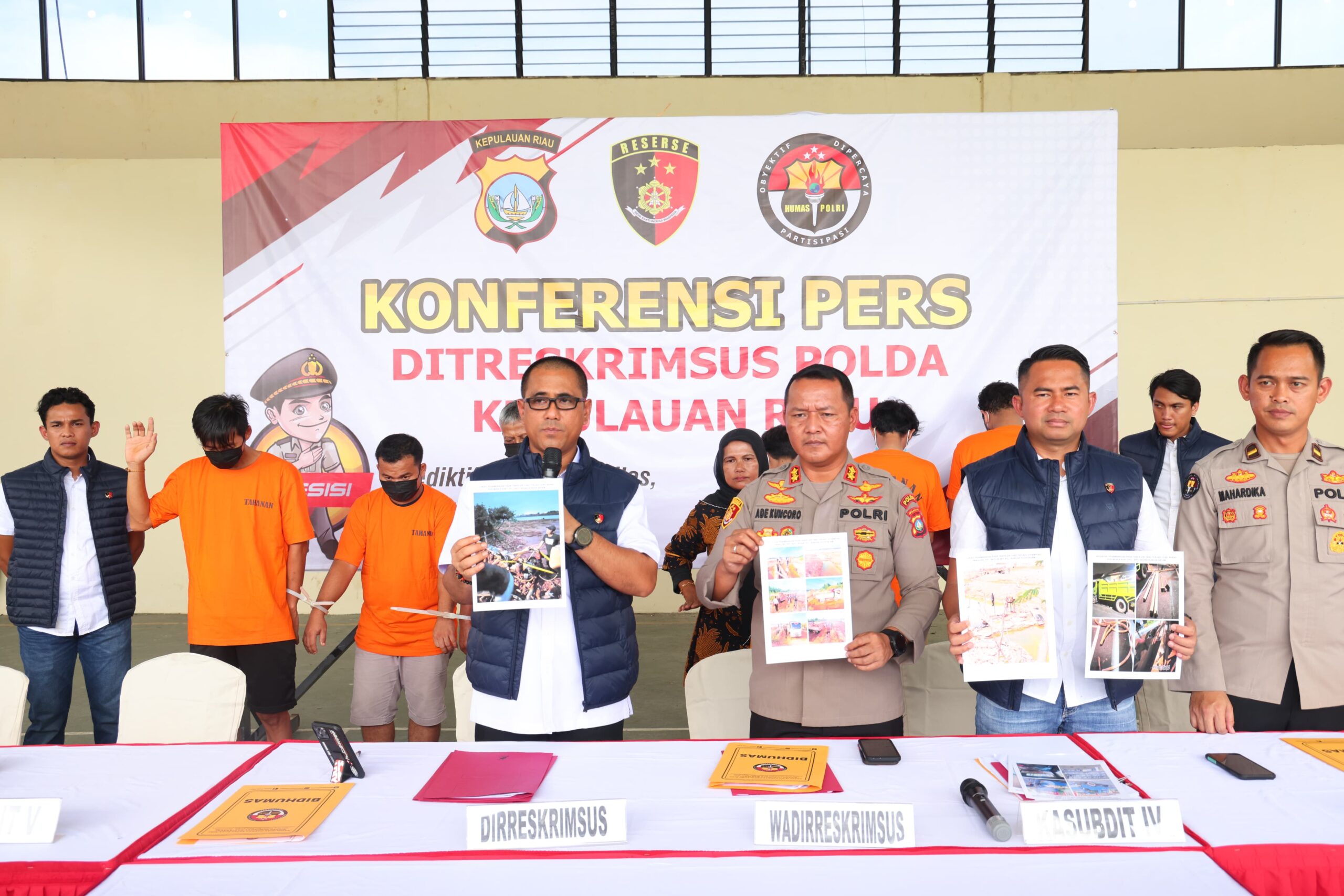 Batam, Ditreskrimsus Polda Kepri berhasil amankan 2 tersangka kasus Tindak Pidana Tambang Pasir Ilegal yang terjadi di wilayah Batu Besar, Nongsa, Kota Batam. Hal tersebut disampaikan oleh Dirreskrimsus Polda Kepri Kombes. Pol. Putu Yudha Prawira, S.I.K., M.H., didampingi Wadirreskrimsus Polda Kepri AKBP Ade Kuncoro Ridwan, S.I.K., Kasubdit 4 Tipidter Ditreskrimsus Polda Kepri Kompol Zamrul Aini, S.H., S.I.K., M.H., M.B.A., Kasubdit 5 Cyber Ditreskrimsus Polda Kepri AKBP Henry Andar H. Sibarani, S.I.K., dan PS. Paur 2 Subbidpenmas Bidhumas Polda Kepri Ipda Mahardika Sidik, S.Kom., M.M., pada saat Konferensi Pers di Hanggar Cakra Buana Samapta Polda Kepri. Selasa (06/02/2024).