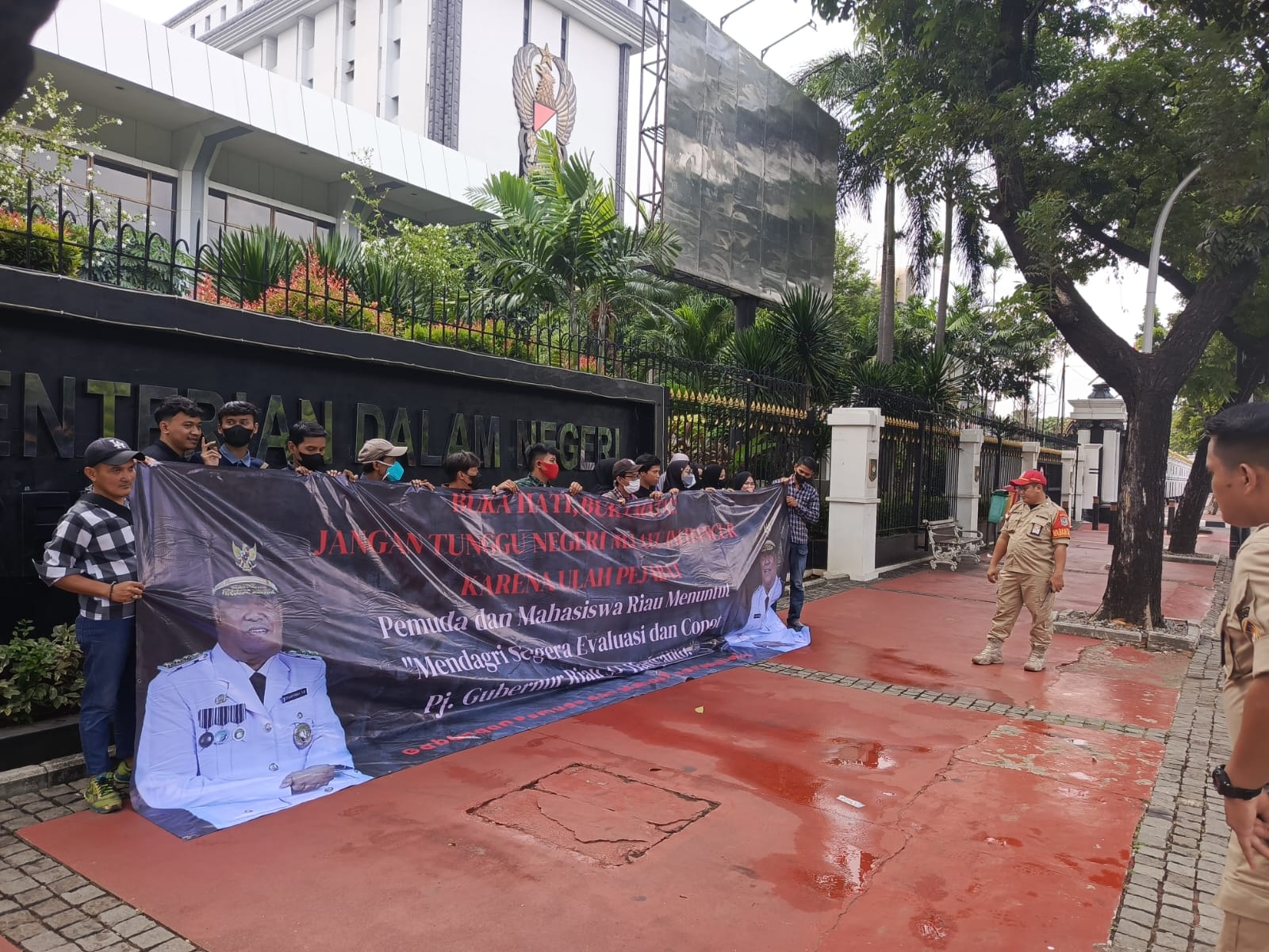 Kekecewaan itu dituangkan dalam spanduk bertuliskan “Pemuda dan Mahasiswa Riau Menuntut Mendagri Segera Evaluasi dan Copot Pj Gubernur Riau SF Hariyanto”, dan menyampaikan lima tuntutan.