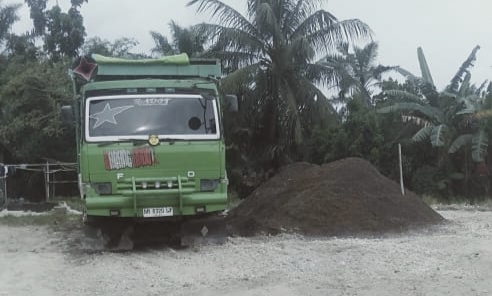 Berdasarkan pantauan di lokasi, terlihat truk bewarna hijau sedang bongkar cangkang di gudang milik Rahman dan menimbulkan aroma yang tak sedap diakibatkan oleh limbah yang terkandung di dalam dicangkang.