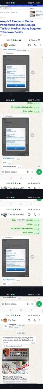 Sebelumnya pada tanggal 29 Juli 2024, Pemred Jelajah Perkara, Persada Sembiring melampirkan bukti transfer dana sebesar Rp 50.000.000 di rekeningnya untuk penghapusan berita togel di Semarang Utara melalui vio sari di pemberitaannya yang saat ini sudah di hapus.