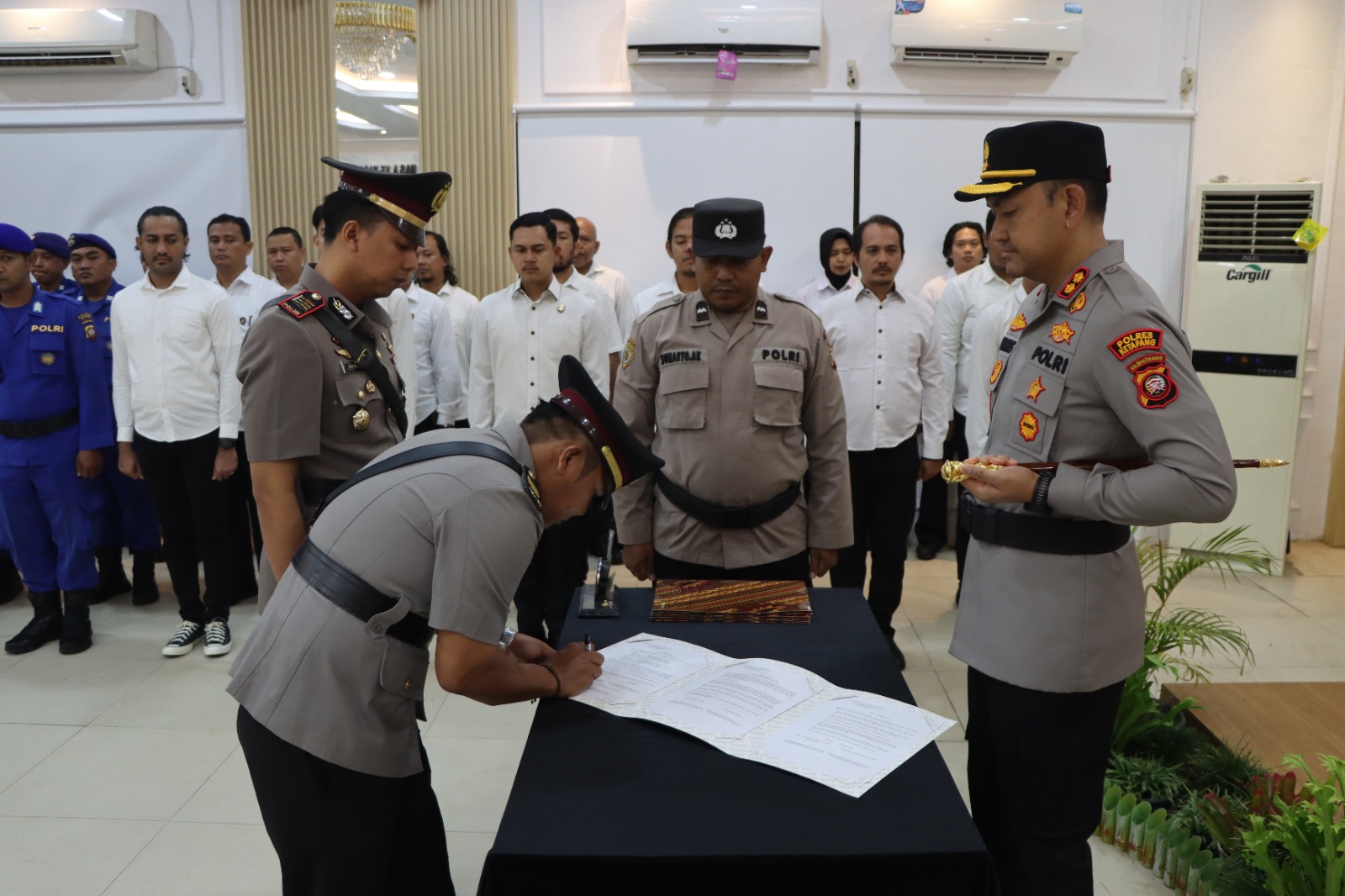 Mitratnipolri.id || Ketapang – Polda Kalbar – Kapolres Ketapang, AKBP Muhammad Harris, S.H., S.I.K., M.I.K., CPHR., memimpin upacara serah terima jabatan (sertijab) Kasat Samapta, Kasat Intelkam, Kapolsek Matan Hilir Selatan dan Kapolsek Jelai Hulu. Upacara sertijab tersebut digelar di Aula Mapolres Ketapang di Jalan Brigjend Katamso Nomor 01 Ketapang, Kamis pagi (11/09/2025).