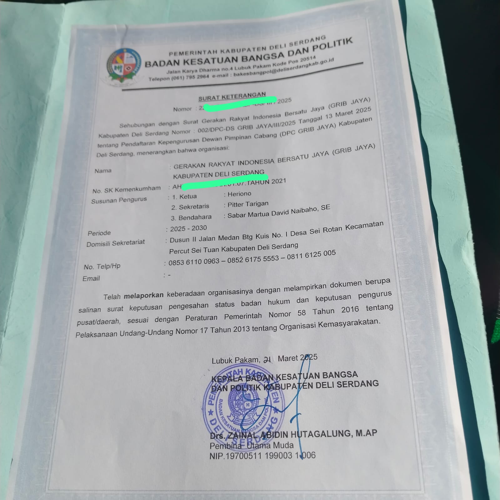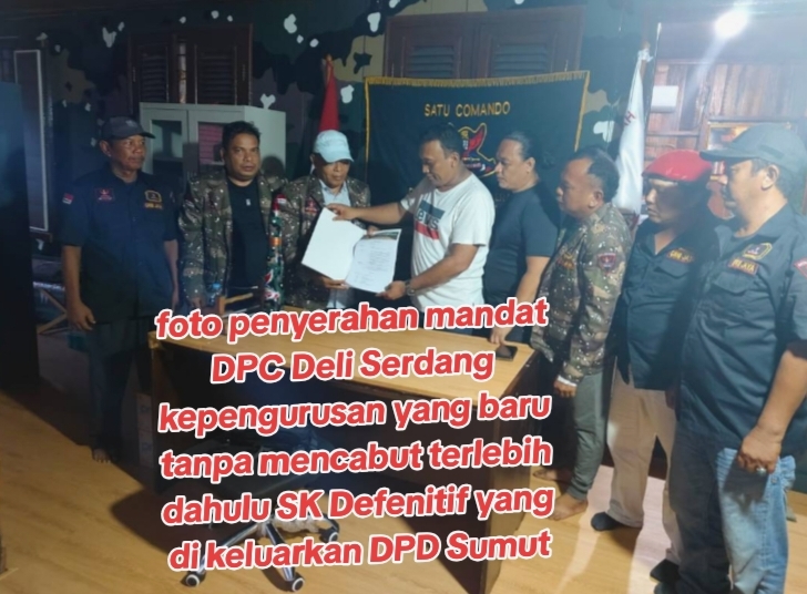 Lanjutnya, “Gedung, teratak, dan MC untuk pelantikan sudah saya sewa dan sudah saya lunas kan dengan biaya sendiri, Kesbangpol dari Pemkab Deli Serdang sudah kami urus dan sudah diterima. Ehh tadi siang 28/05/2025 saya melihat di grup whatsapp Sekretaris Daerah Darmanta Ginting sedang memberikan Mandat kepengurusan DPC Grib Jaya kabupaten Deli Serdang yang baru” ucap Heriono Selaku ketua DPC Grib Jaya kabupaten Deli Serdang yang sah secara SK Defenitif Nomor: 048/DPD – GRIB – Sumut /II/2025 yang dikeluarkan pada tanggal 26 februari 2025.