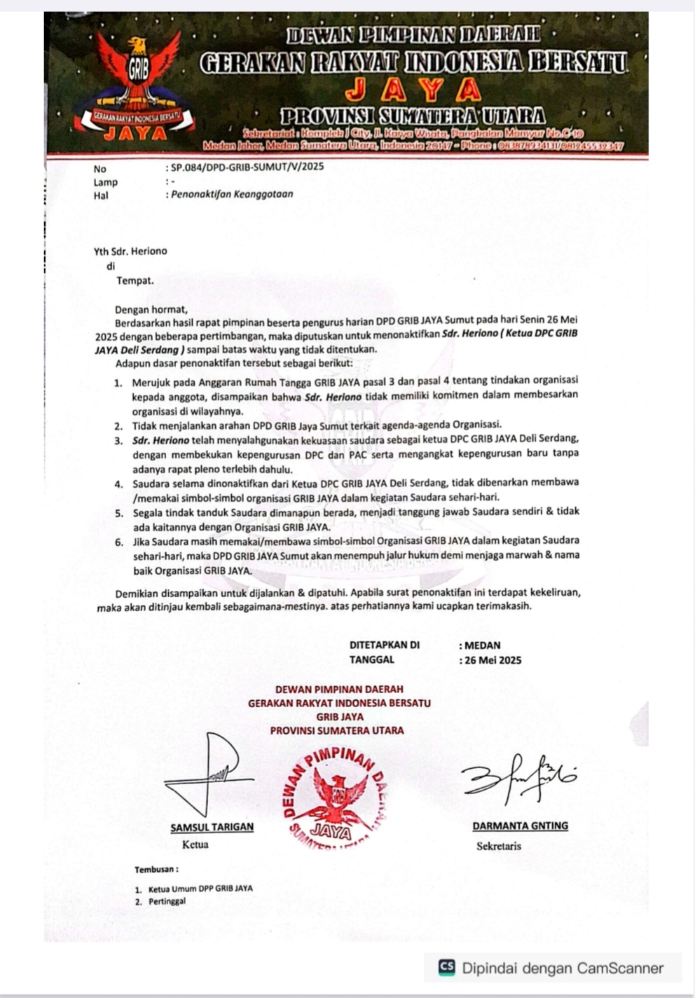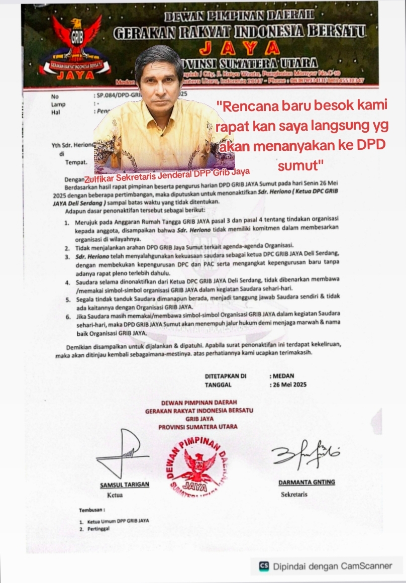 Saat Berbincang dengan Ketua DPC Grib Jaya kabupaten Deli Serdang Ketua Heriono mengatakan ” Aneh Sekali saya melihat organisasi Grib Jaya DPD Sumut ini, saya dinonaktifkan berdasarkan PDF yang dikirimkan Sekretaris DPC kami sendiri Yang bernama P Tarigan yang merupakan keluarga dekat Ketua DPD Grib Jaya Sumut Samsul Tarigan.