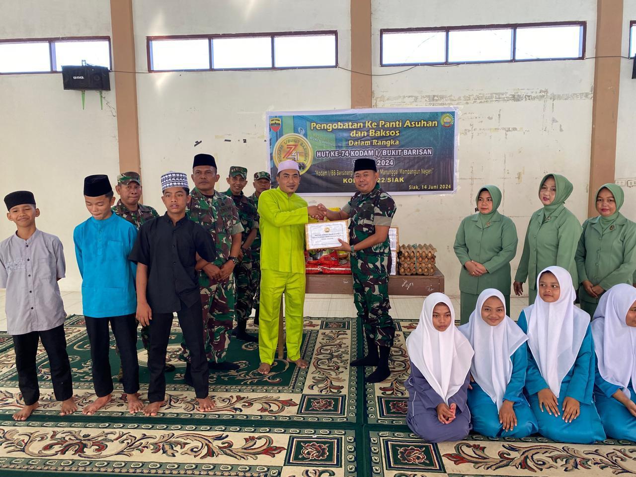 Acara dimulai dengan sambutan dari pimpinan panti asuhan, diikuti oleh sambutan dari Dandim 0322/Siak, Letkol Arh Riyanto Budi Nugroho. Dalam sambutannya, Dandim menyampaikan bahwa kegiatan bakti sosial ini merupakan bagian dari rangkaian peringatan HUT ke-74 Kodam I/BB. Ia menegaskan bahwa kegiatan anjangsana, pengobatan, dan bakti sosial ini adalah kegiatan rutin yang dilaksanakan untuk bersinergi dengan masyarakat dan membangun negeri.