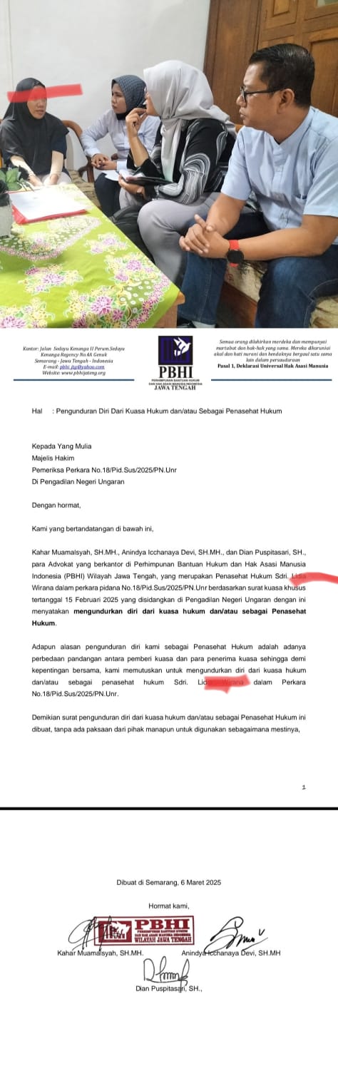 Oleh karena adanya perbedaan pandangan dan prinsip dalam pendampingan, PBHI Wilayah Jawa Tengah dan Pemerhati/Aktivis Perempuan dan Anak, Romauli Situmorang menyatakan mengundurkan diri dari pendampingan LW di Pengadilan Negeri Kabupaten Semarang sejak tanggal 5 Maret 2025.