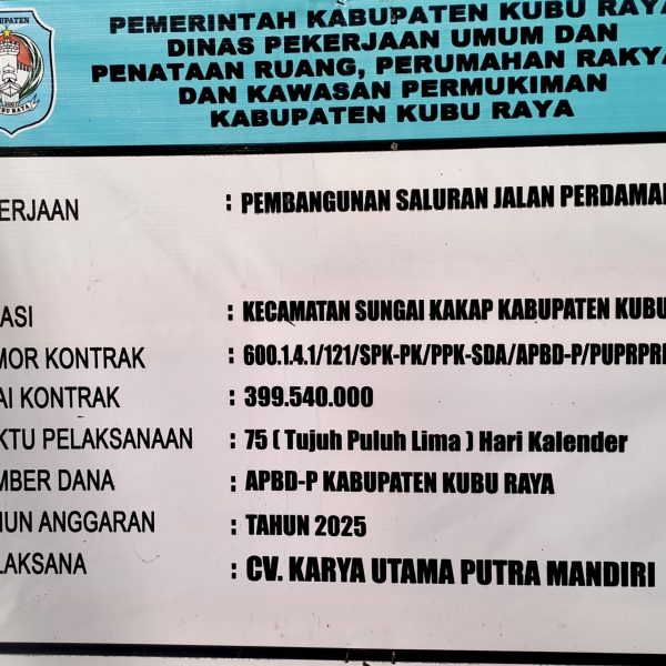 Proyek tersebut tercatat memiliki Nomor Kontrak 600.1.4.1/121/SPK-PK/PPK-SDA/APBD-P/PUPRPRKP/X/2025, dengan nilai kontrak sebesar Rp 399.540.000, waktu pelaksanaan 75 hari kalender, dan menggunakan sumber dana APBD Kabupaten Kubu Raya Tahun Anggaran 2025.Adapun pelaksana pekerjaan adalah CV. Karya Utama Putra Mandiri.