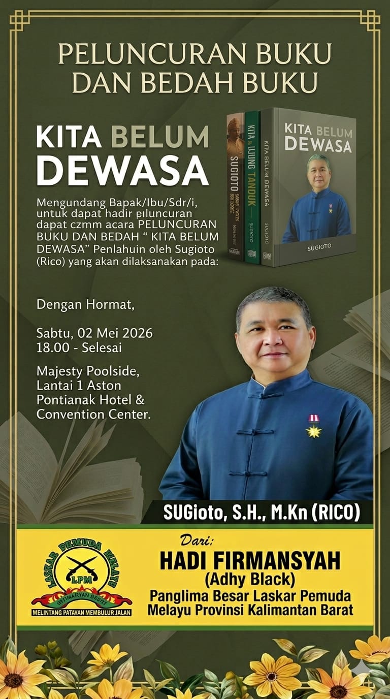 Mitratnipolri.id. Pontianak, Kalimantan Barat — Panglima Besar Laskar Pemuda Melayu Kalimantan Barat, Adhi Black, secara resmi menyampaikan ucapan selamat kepada Sugioto, SH., M.Kn (Rico) atas terbitnya buku berjudul “Kita Belum Dewasa”, sebuah karya yang mengangkat refleksi mendalam tentang kedewasaan dalam berpikir, bersikap, dan menyikapi realitas kehidupan.