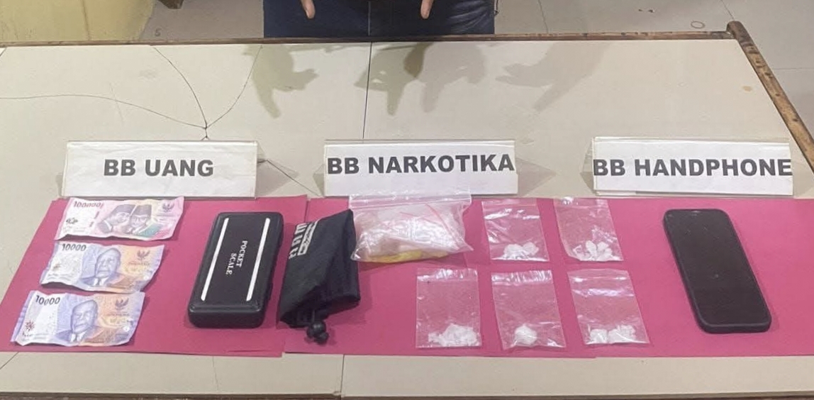 Selanjutnya dilakukan penggeledahan dengan disaksikan oleh Ketua Dusun setempat pada penguasaan pelaku tim menemukan 5 Paket diduga Narkotika Jenis Sabu, 1 pack plastik klip bening kosong, Timbangan Digital warna Silver beserta sarung, Handphone, dan uang sejumlah Rp. 120.000,- (seratus dua puluh ribu rupiah).