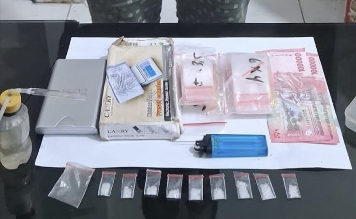 Kemudian Tim melakukan penggeledahan, tepatnya di belakang rumah, yang ada pondoknya dan menemukan barang bukti yang berkaitan dengan tindak pidana Narkotika berupa kotak putih yang berisi 9 bungkus plastik bening, timbangan merk Camry, Rp 200 ribu, alat hisap, botol plastik, kaca pirex, pipet dan barang bukti lainnya.