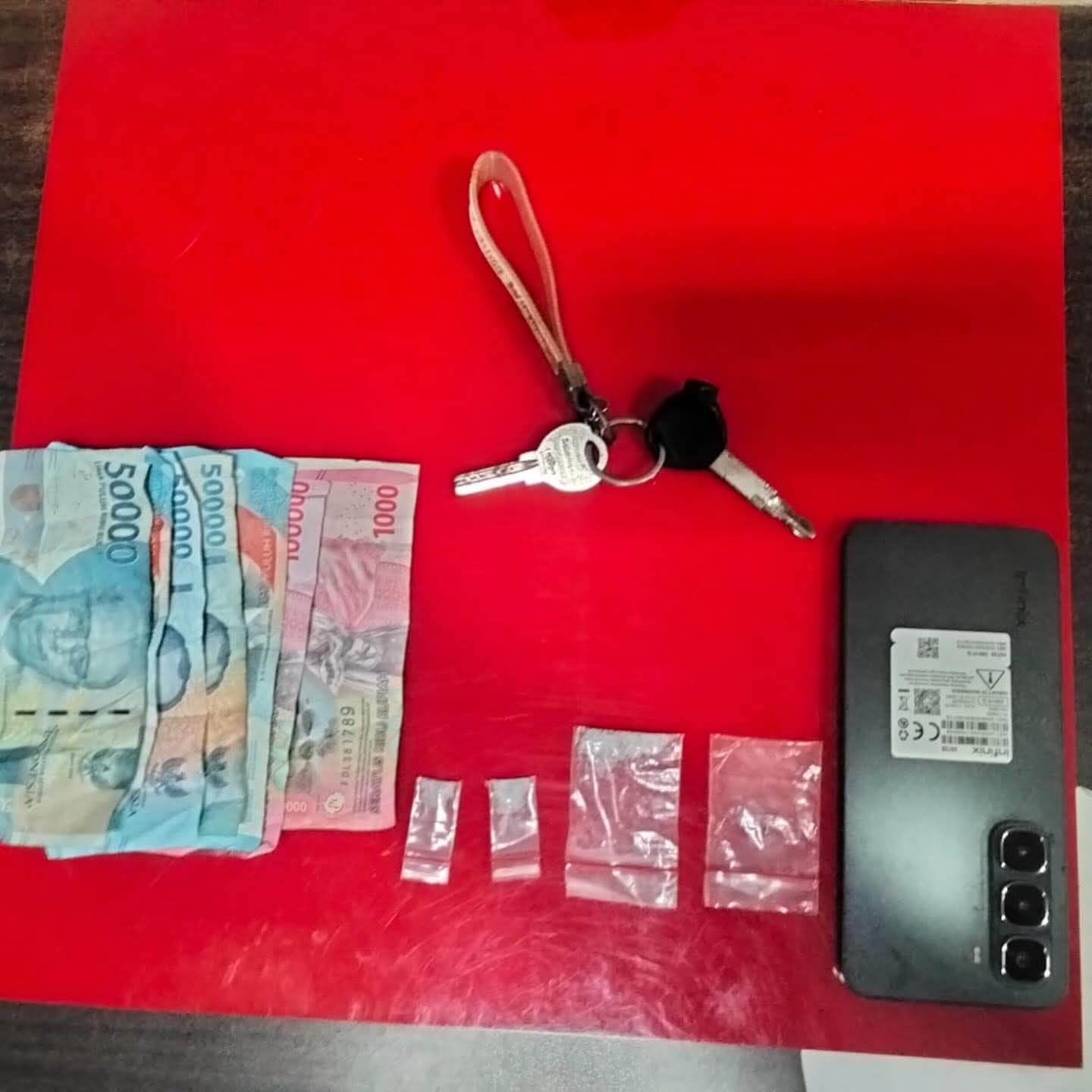 Setelah memastikan kebenaran informasi, tim yang dipimpin AIPDA Ronaldi bergerak ke lokasi dan berhasil mengamankan tersangka tanpa perlawanan. Dari hasil penggeledahan, petugas menemukan tiga paket narkotika jenis sabu yang dibungkus plastik klip bening, uang tunai sebesar Rp450.000, satu unit telepon genggam, serta satu unit sepeda motor.