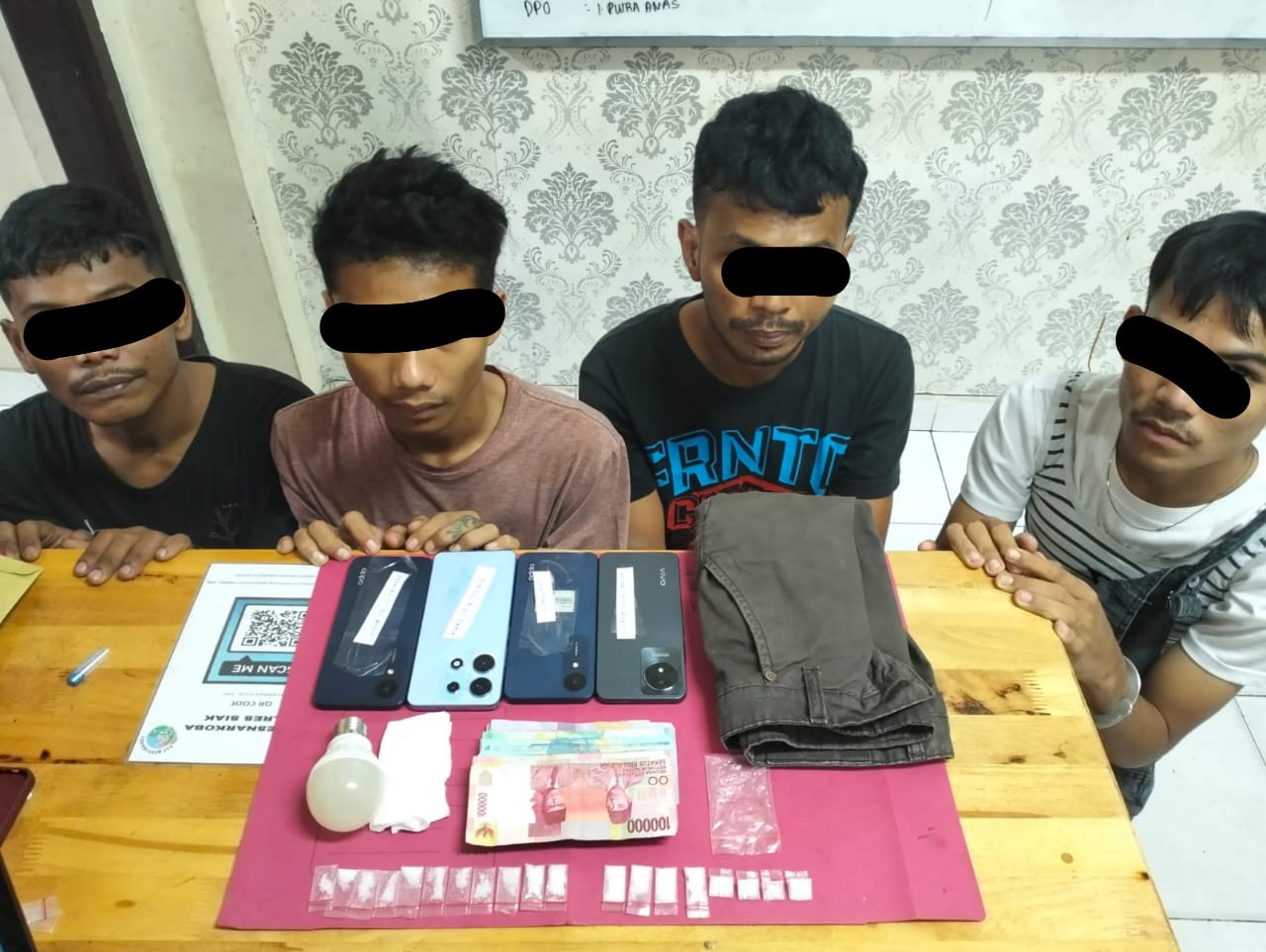 MR (19), MH (18) MZ (34) dan FA (30) diamankan Satres Narkoba Polres Siak dengan barang bukti 19 (sembilan belas) paket Narkotika jenis shabu dengan berat kotor 4,79 (empat koma tujuh puluh sembilan) gram.