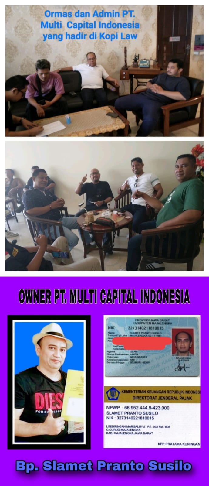 Slamet Pranto Susilo sebagai pemilik dari PT. Multi Capital Indonesia, saat ini dikabarkan menghilang dan tidak dapat dihubungi lagi.