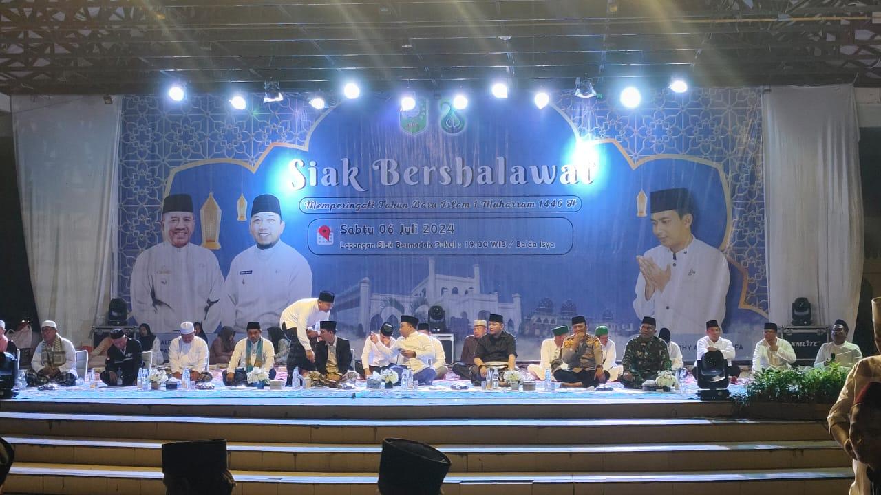 “Alhamdulillah, saya mewakili Bapak Bupati Siak Alfedri dan juga atas nama Pemerintah Daerah Kabupaten Siak sampaikan ucapan terimakasih kepada masyarakat Kabupaten Siak dan pemangku kebijakan lintas sektor dan tokoh masyarakat, serta seluruh Aparatur Sipil Negara (ASN) dalam mensukseskan Doa dan Gebyar Sholawat dalam rangka menyambut Tahun Baru Islam 1446 Hijriyah ini”, Ucap Husni Merza.